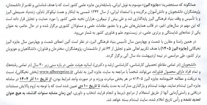 لازم به ذکر است بنیاد فرهنگی البرز آمادگی معرفی و توضیح و تفسیر «شیوه نامه جایزه البرز 1405» از طریق برگزاری جلسات مجازی را دارد. شماره تماس 09022439854 برای ارتباط با دبیرخانه علمی جایزه البرز و دریافت هرگونه اطلاعات تکمیلی معرفی میشود.